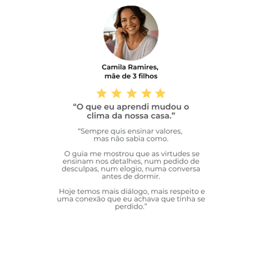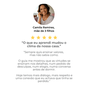 O Filhos de Caráter foi criado para guiar mães e pais passo a passo na formação moral e emocional dos filhos, com exemplos reais, reflexões práticas e uma linguagem leve, acolhedora e fácil de aplicar.