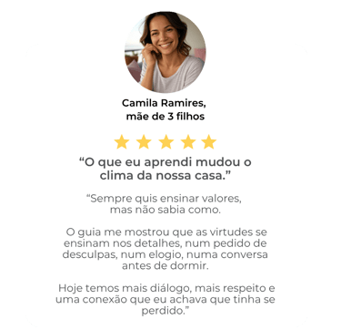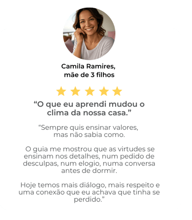 O Filhos de Caráter foi criado para guiar mães e pais passo a passo na formação moral e emocional dos filhos, com exemplos reais, reflexões práticas e uma linguagem leve, acolhedora e fácil de aplicar.